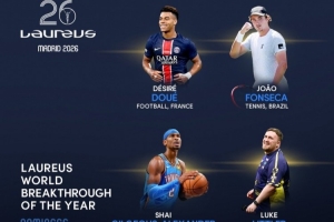 体育资讯3月3日讯 2026年劳伦斯最佳突破奖候选名单出炉,巴黎边锋杜埃在列。