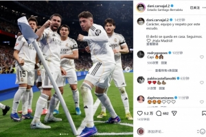 皇马后卫卡瓦哈尔社媒晒照庆祝胜利,配文:“韧性、团队精神与对这枚队徽的敬意。”