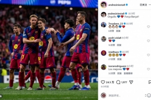 巴萨传奇中场伊涅斯塔社媒晒出球员们的赛场合照,鼓励后辈,配文:“骄傲,加油巴萨!”